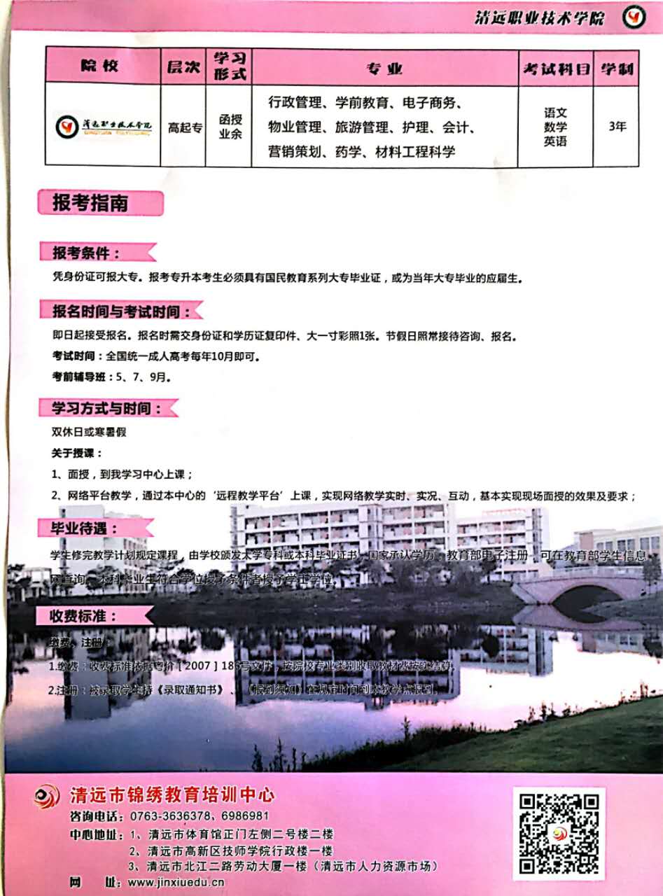 北京大學、清遠職業(yè)技術學院圓夢計劃正式啟動,三年學費只需5000元,考試前一百名三年學費只需1000元,心動不如行動,趕快加入圓夢計劃吧!咨詢熱線:0763-3630112 報名地址:清遠市北江二路勞動大廈一樓