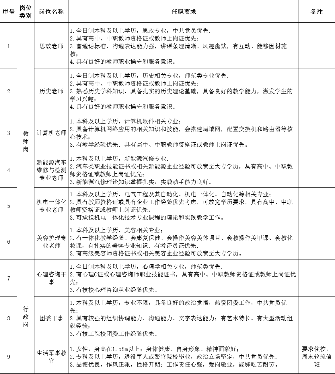 4、教師崗需本科及以上學歷,碩士優(yōu)先;文化課教師需持有相應(yīng)的教資;專業(yè)課教師持有相應(yīng)技能證書/職稱或相應(yīng)行業(yè)經(jīng)驗優(yōu)先錄用。