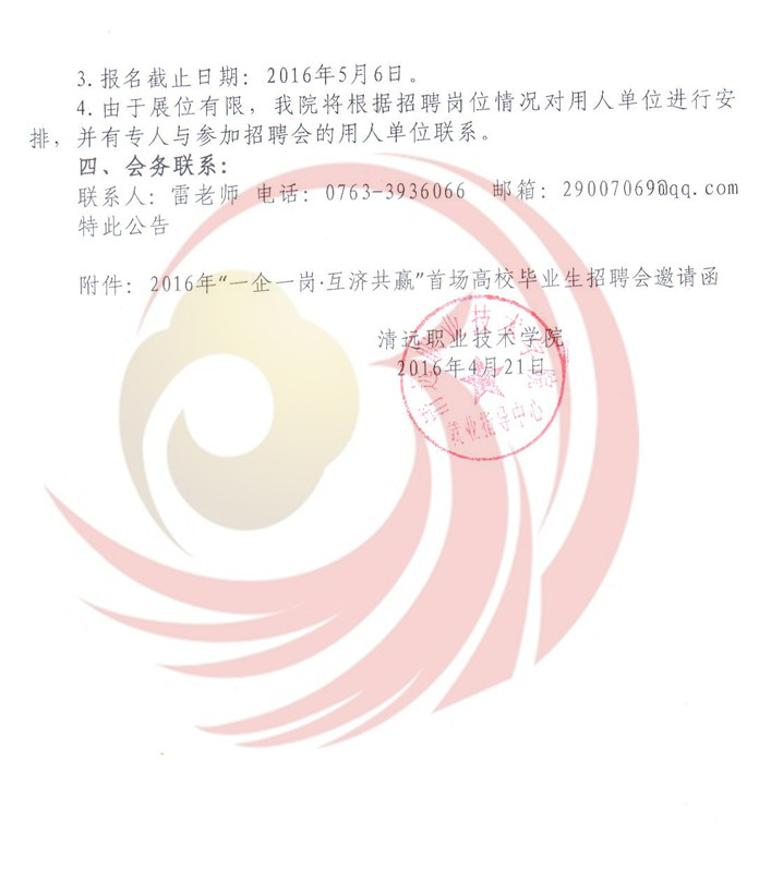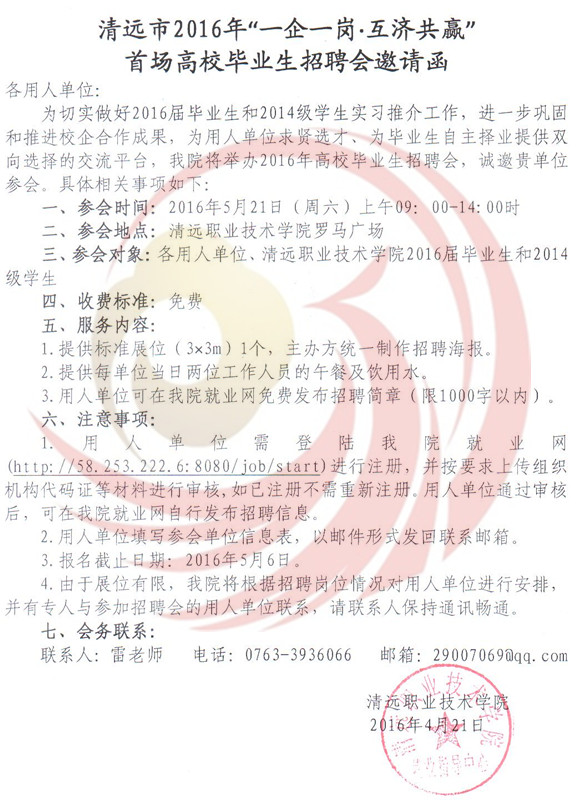為深入貫徹落實(shí)《國(guó)務(wù)院關(guān)于進(jìn)一步做好新形勢(shì)下就業(yè)創(chuàng)業(yè)工作的意見》(國(guó)辦﹝2015﹞23號(hào))精神和廣東省人社廳有關(guān)就業(yè)服務(wù)工作及開展“一企一崗▪互濟(jì)共贏”高校畢業(yè)生找屁活動(dòng)的部署要求,根據(jù)教育部2016屆高校畢業(yè)生就業(yè)創(chuàng)業(yè)工作網(wǎng)絡(luò)視頻會(huì)議精神和廣東省2016年普通高等學(xué)校畢業(yè)生就業(yè)創(chuàng)業(yè)工作會(huì)議精神,進(jìn)一步做好我市2016年高校畢業(yè)生就業(yè)服務(wù)工作,促進(jìn)2016屆畢業(yè)生順利就業(yè)。清遠(yuǎn)市人力資源四川和社會(huì)保障局,清遠(yuǎn)市職業(yè)技術(shù)學(xué)院和清遠(yuǎn)市職業(yè)教育集團(tuán)聯(lián)合主辦的2016年“一企一崗▪互濟(jì)共贏”首場(chǎng)高校畢業(yè)生招聘會(huì)定于5月21日在清遠(yuǎn)市職業(yè)技術(shù)學(xué)院舉辦,屆時(shí)將有清遠(yuǎn)本地、東莞、珠三角其他地區(qū)等企業(yè)入場(chǎng)設(shè)點(diǎn)招聘,歡迎各用人單位到清遠(yuǎn)市職業(yè)技術(shù)學(xué)院選聘人才。